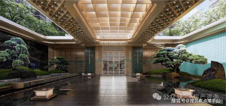 以“凤凰展翼”为灵感,设计约52米U字型超长门府界面,约7米高超尺度归家大堂,双层飘板塑造凤凰展翼的大气形态,居住者的气派门面