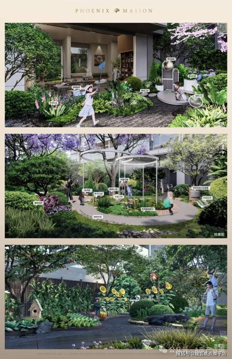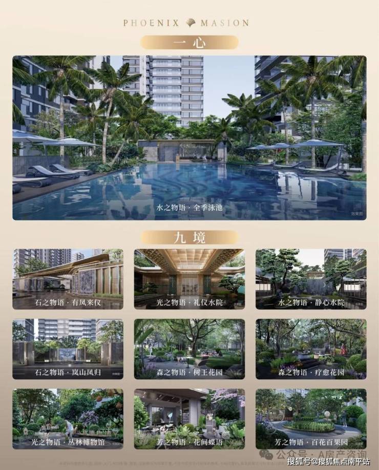 以全季泳池为核心,匠造“一心九境”园林空间,涵盖树王花园、疗愈花园、丛林博物馆、花间蝶语、百花百果园等