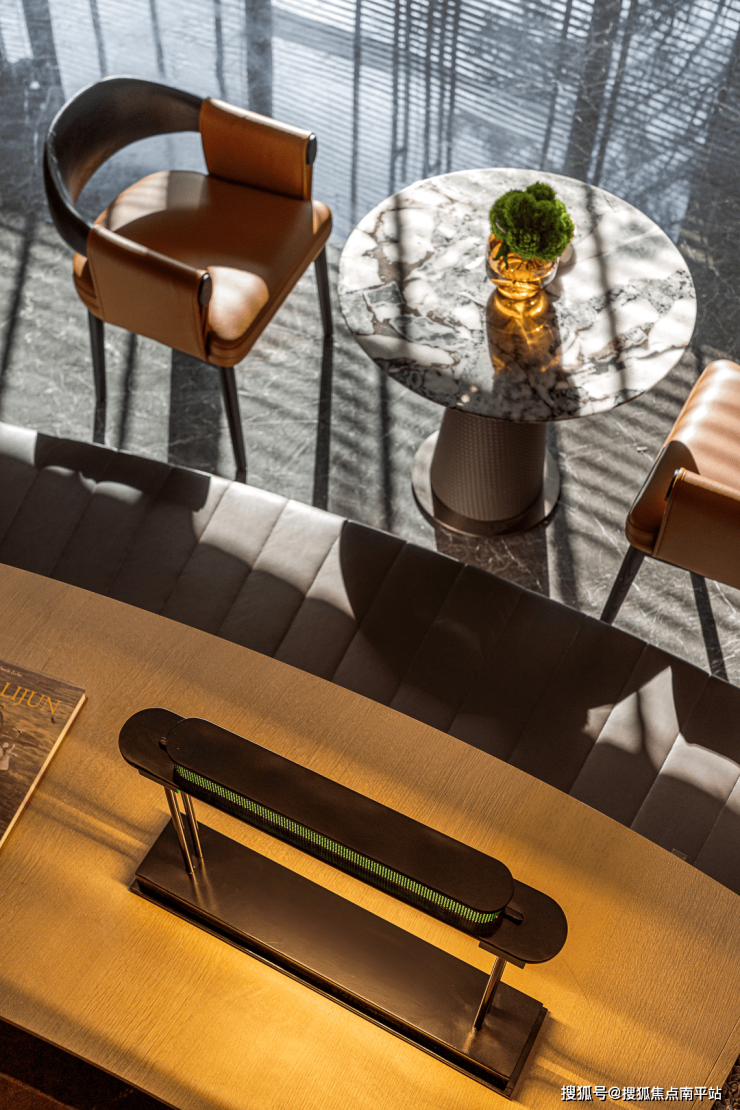 水云本无形,但又可以成为任何一种已知的形状。视线跟随空间的弧度婉转游走,会遇见椭圆形的穹顶天窗,同样圆形的沙盘是设计的呼应,任由光的情绪去渲染,穿过大簇的绿植洒下凉爽。