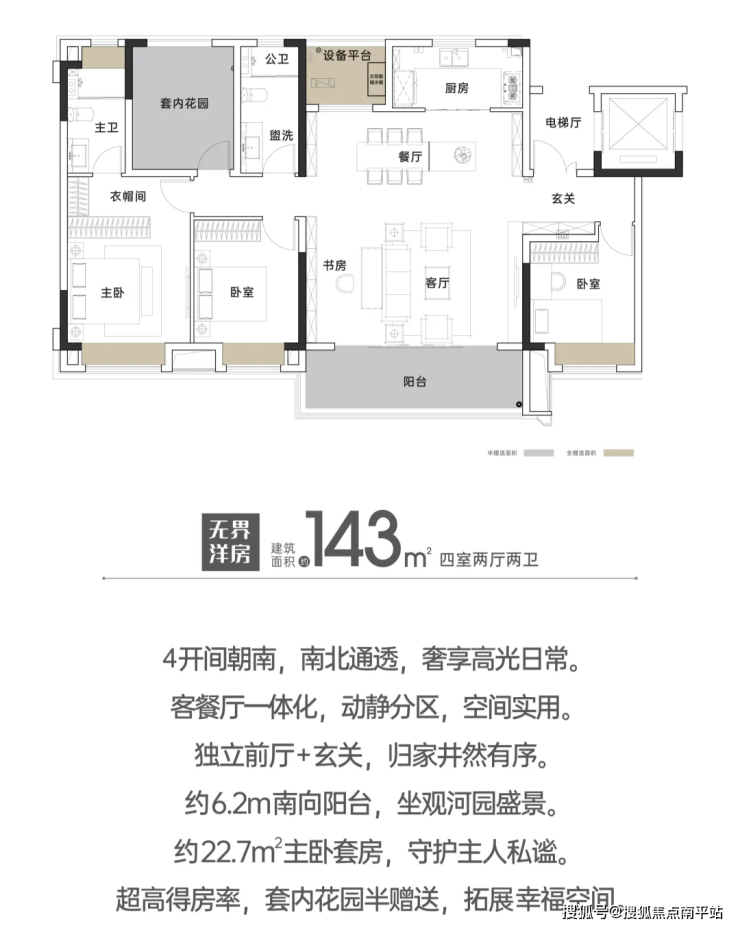 项目首发无界洋房,143平与169平两个面积段,都是一梯两户,得房率高达99%。户户有独立电梯前厅,搭配独立入户玄关,私密性及尊崇感更强。