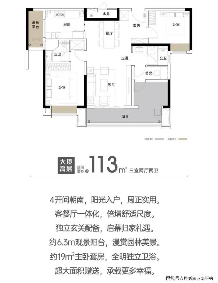 项目同步还将推出高层产品,建面约113平方的三房和131平方的四房,空间通透实用且赠送面积大,层高达到3米,而市面上同类产品一般都只有 2.9米,高下立见。