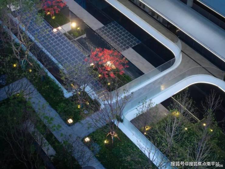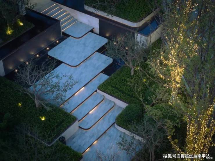 中心水景庭院巧妙地运用高差叠级关系,把景观空间划分出上中下三层立体空间,整个景观仿若一个立体剧院。