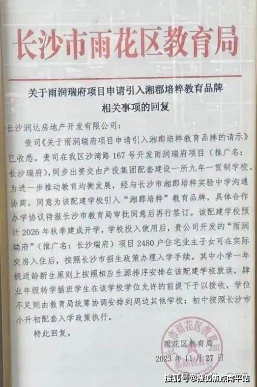 项目将配建托儿所、幼儿园以及一所九年一贯制学校,已确定引入长沙四大名初之一的“湘郡培粹”品牌,学校预计2026年秋季建成开学,小区业主子女均可配套入读。