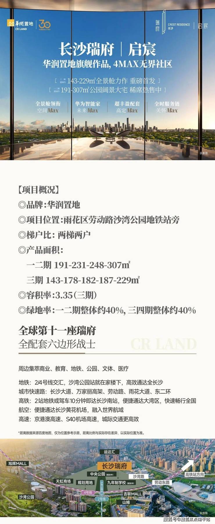 长沙瑞府属央企华润的高端住宅“瑞府”系列,总占地约13.8万方,总建面约53万方,分四个组团围绕小区绿化对称排列,呈围合式分布,小区正中央拥有较大的景观中庭。