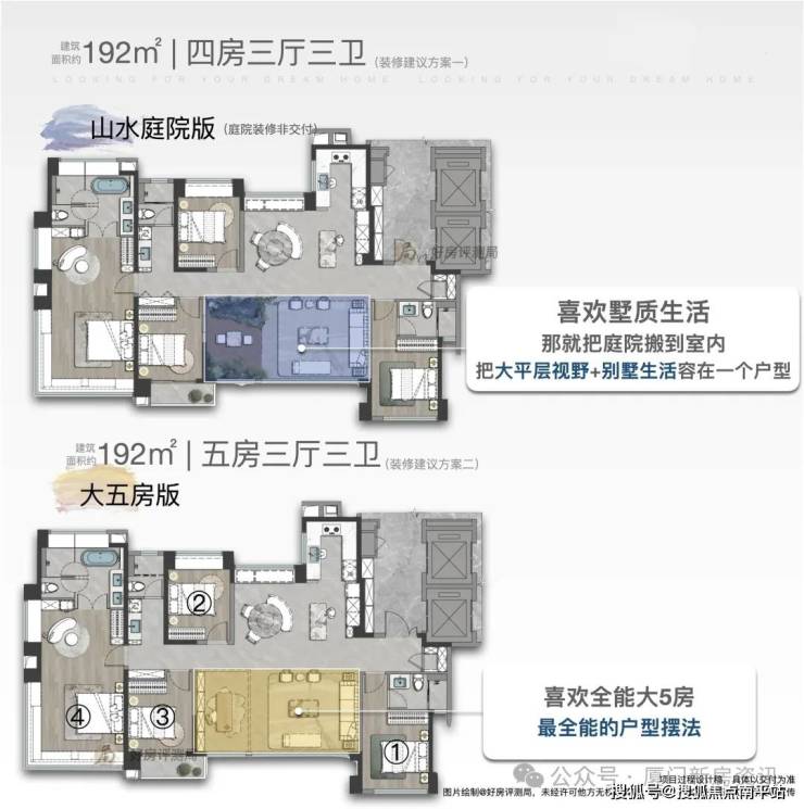 最后,建面约192㎡五房,在客厅中引进山水庭院(庭院装修非交付),呈现出空中别墅的生活氛围,此外,南向约18.5米四开间,南北四大对流,约40㎡星级主卧,带有独立卧私厅,衣帽间,独立卫浴等,还配置了约11米极致飘窗,好比自带广角的巨幕影屏,该户型还可定制为四房南向书房版,营造高雅生活。