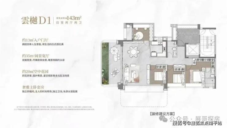 就拿 143 平四房户型来说,综合使用率直接拉到 113%,单露台面积就有约 20 个平方,还带 6 米挑高。现场看完我直接心动:摆上双人沙发、花架,再放个小茶台,周末晒晒太阳、看看云,这不就是理想中的慢生活?要是约朋友来烧烤,从客厅一步就能跨到露台,社交动线丝毫不绕,比很多大平层的露台实用多了。