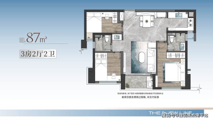 享受级大三房,整个户型结构紧凑,无浪费空间,使用率约93.5%。这个户型,不能只看户型图,在装修体验馆里才能感觉到它那 6米宽巨型方厅,270度环幕观景/采光所带来的震撼感。光看餐厨空间,会有一种进入150+户型的错觉,而三个卧室南向并排,空间尺度都很舒展(8#),主卧双面看湖无遮挡,预计实景效果惊艳。这是一个能够享受生活的户型,对于很多小家庭来说,三房够了,不差钱的话可以入手。