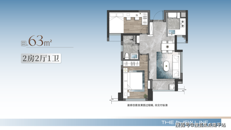 63㎡两房户型,和73㎡结构类似,面积少了10㎡, 最低的代价享受岛外顶级配套,但套数不多。两个户型 客厅面宽都做到了3.4m,实属难得。