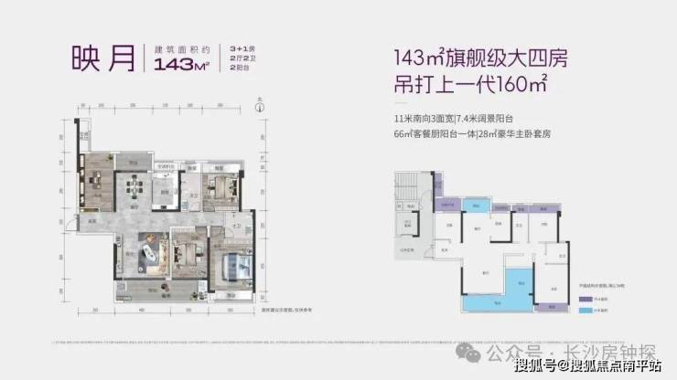 - 建面约143㎡(3+1房2厅2阳台):得房率约101%,比肩160㎡+户型。14.4米南向4面宽,7.8米MAX观景阳台,49㎡LDKB全场景社交厅,27㎡主卧套房,灵活的“3+1”空间,可根据需求打造书房、儿童房,实用性拉满。