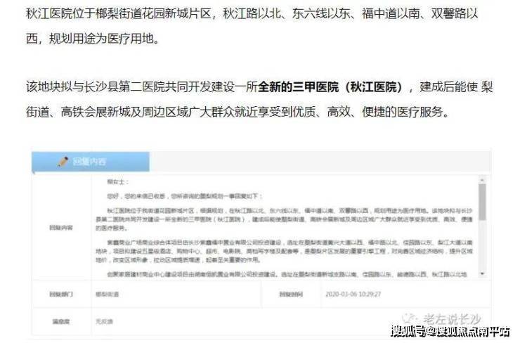 根据最新规划长沙县秋江医院将重新择址,预计总投资8个亿的三甲医院为您的健康保驾护航,让您在家门口享受到与经济社会发展相匹配的健康服务。