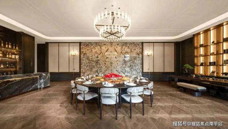 例如联发建发御湖,从归家的超级通道星级酒店式环岛落客区,到 高约 11.5m、宽超50m的奢阔社区大门,耗巨资打造的湖景私宴厅、雅集茶室等高定空间,再到 约72m艺术风雨连廊 等景观节点,都已经实景呈现。