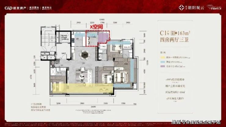 ◦ 163㎡大平层:独创的4+1房百变户型(强烈建议买家保留北向这个X空间,它会带给你别样的生活享受),超50㎡客餐厅一体化+约9米宽大阳台+约5.9米大客厅+奢阔主卧套房,餐厅开间做到了约5.2米,足以放下10人位大圆桌,尽显大宅尺度,三胎家庭、四代同堂都能从容应对。