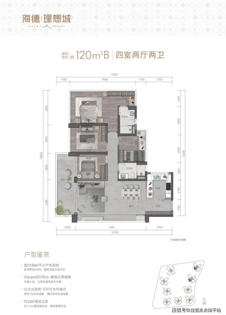 B款户型则如同“空间魔方”,全屋赠送约30平方米。四开间朝南且直面园林,享一线园林景观。该户型设计动静分区,约6.6米阔景阳台与餐客厅无界相连,引景入室,让阳光与清风成为家中日常。社交式厨房可开可合,兼顾烹饪乐趣与家人互动。约25平方米主卧拥有约12.3米景观周长线,奢享从容涵养的人生境界。