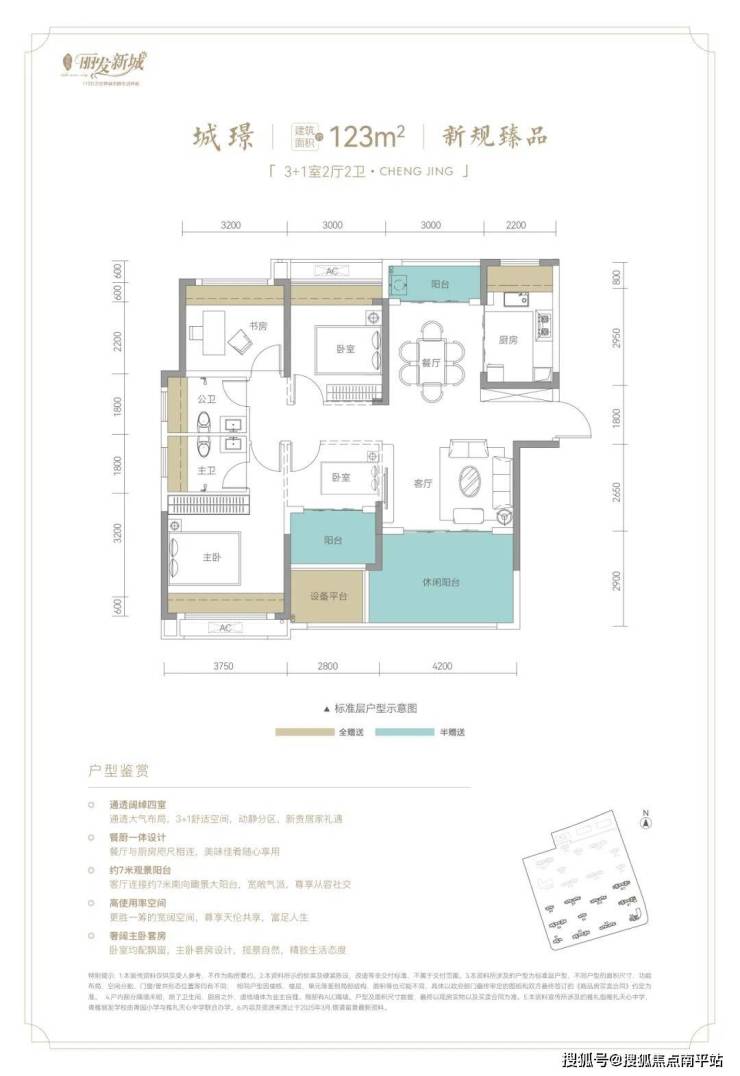 约123㎡户型,南向约4.2m,2.9m进深阳台,与设备平台连成约7m宽景阳台,全屋通风采光更加。