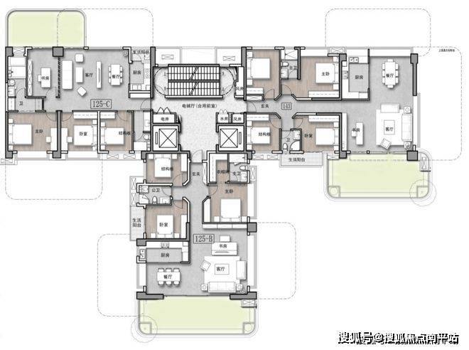 际华园·荷府T3非拼接户类似T2采用端厅方式,满足公区三面出挑,享受三面开敞的通透视野。公区规整开放,LDKG衔接提供多种生活场景的可能性。双套房明卫尺度合理。拼接户型则采用横厅南北转换方式,解决露台挑出方向不够的问题,可保证从公区进入露台。LDK横厅形成客餐厅三个方向露台出入空间。南向主卧套房功能完善,空间奢侈,充分提升主人品质及舒适度。