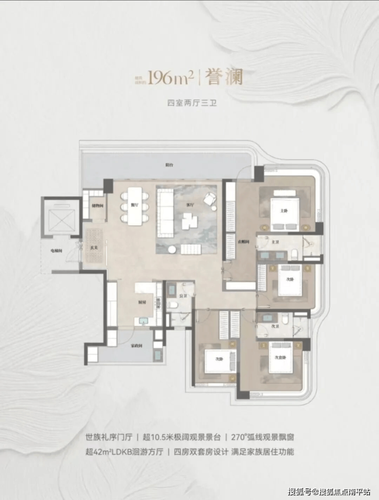 205㎡四室两厅三卫:以42㎡洄游方厅、10.5 米奢阔观景露台为核心,强化空间通透感;