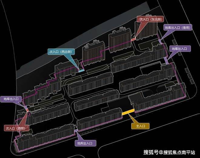 项目在东、西、南侧规划了机动车进出入口,在北、南、西侧规划了人行进出入口。这样的设计,去学校、河畔等不同位置均有最近的通路。