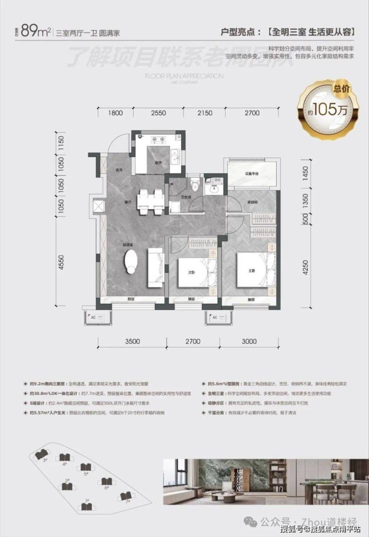 依据人体工程学的标准和家具陈列的细致考量,优化布局,实现实用性强、灵活的功能分区,完成对每一寸居住空间的精确运用,打造居住舒适、收纳得体,优雅礼遇的温馨空间,全三居设计,且南向大面宽89户型约9.2米,103户型约10米;110户型约10.7米
