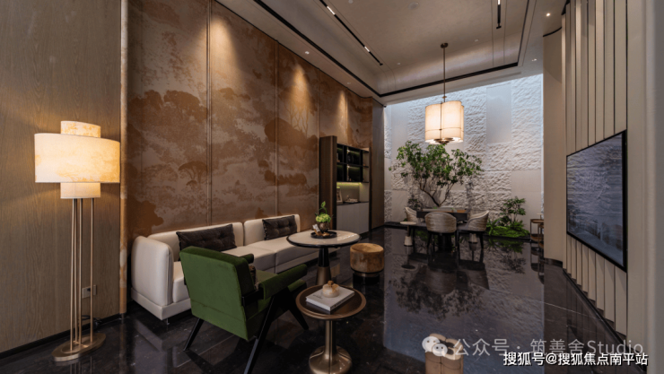 金山少见的双门规制,东门气势也尤为磅礴。步入其中,《蓬莱仙境》非遗漆画与西区山河遥相辉映,烟波浩渺处,藏风聚气,基业长青之意境油然而生。