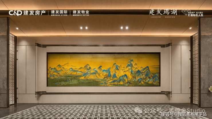 步入门厅,九米巨制《千里江山图》 非遗漆画 映入眼帘,天然大漆经千锤百炼,再现青绿山河的壮阔雄浑,尽显“归家即入画境”的非凡礼遇。