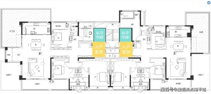 星河院子,全部两梯两户布局,但楼盘设计将2个电梯厅用步梯隔开,相当于私家电梯入户。