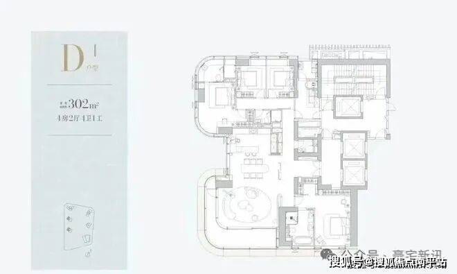 1D栋(1栋四单元)-45层 :均为 3梯2户 ,约 305㎡ ,一层两户。