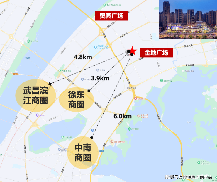其一:武昌区精华——大武昌高端商业集群。项目沿着附近的和平大道、团结大道、欢乐大道南下,便可到达武昌的核心区商业,例如徐东销品茂升级改造的中商世界里、群星城、汉街SKP、在建龙湖滨江天街等。