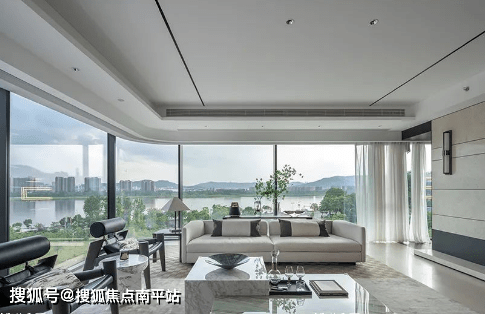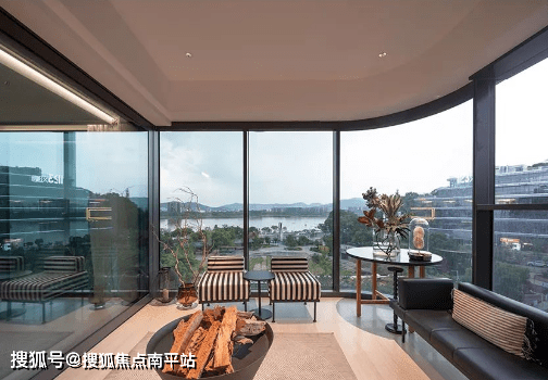 大尺度落地玻璃,每一面窗都是一个无边画框,实现270°开阔视野,眺望湘江,山水无界。