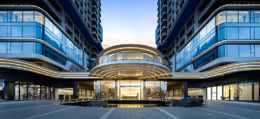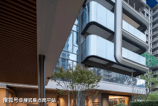 凤起麓鸣在建筑上延续无界公寓的核心理念,舍弃传统的直角幕墙,采用弧形玻璃完成转角过渡。