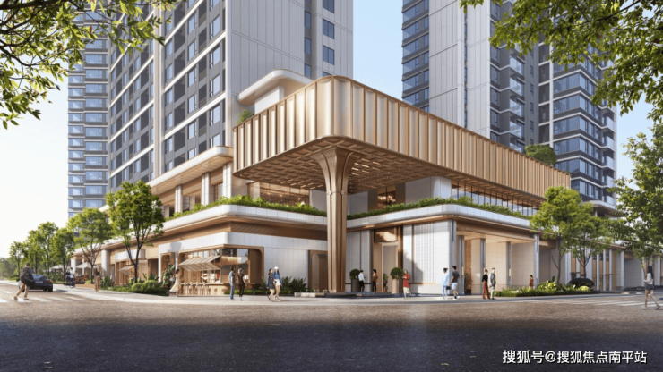 塔楼采用现代简约风格,塔冠采用铝板屋顶构架,古铜色穿孔板造型;塔楼主体部分以米白色仿石漆为主,深灰色仿石漆为辅,同时搭配银灰色与深灰色铝板线条;采用定制化的隔音降噪门窗,充分降低室内噪音影响;裙房部分以石材,幕墙为主,结合景观,室内,共同打造休闲度假的商业氛围。