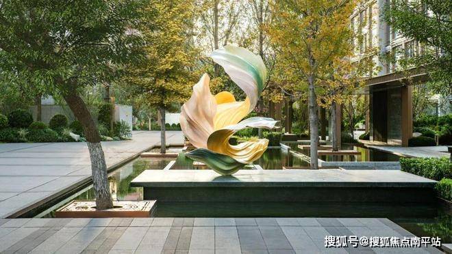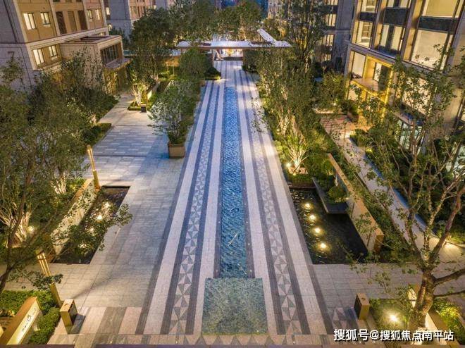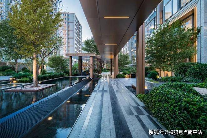 以艺术墙体结合格栅、金属嵌条、跌水、灯光等营造高级感,在精选乔灌木的点缀下,将艺术与自然充分融合。