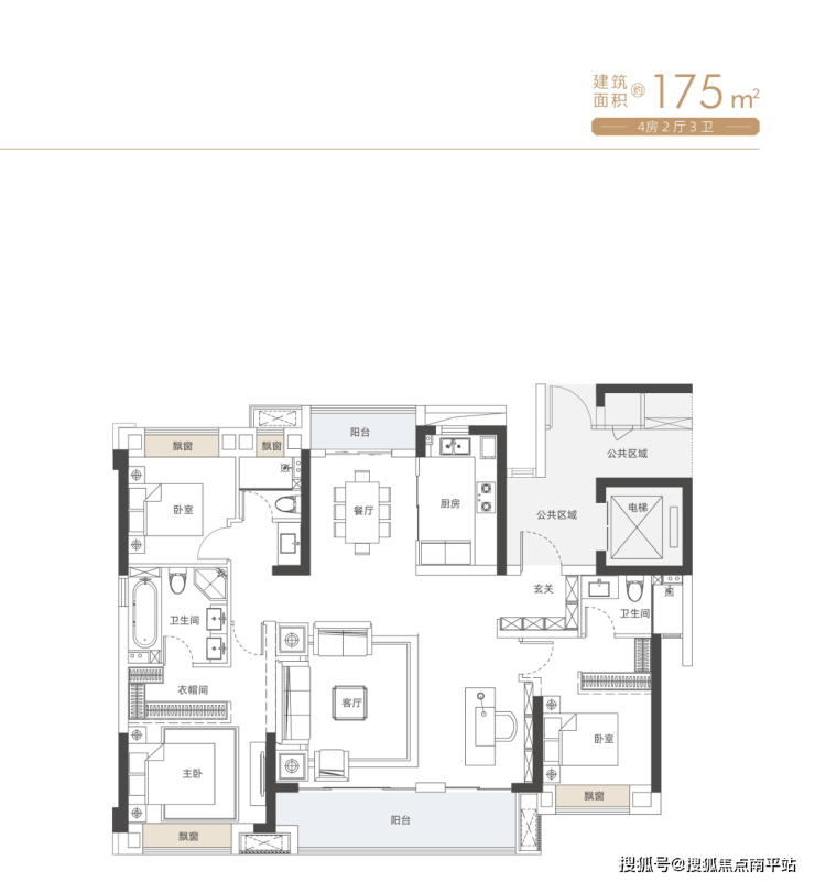 户型整体方正,采用了南北通透的设计,并且实现了三开间朝南,这保证了室内能有良好的自然采光和通风,餐厅与客厅一体化设计,形成大横厅,并与南向的景观阳台直接相连。这不仅延伸了视觉空间感,让公共区域显得非常开阔,也更好地引入了阳光和风景。主卧室是朝南的套房,带有飘窗、独立衣帽间和干湿分离的卫生间,提升了居住的私密性和舒适度。北侧设计有一个书房(可根据需要作为多功能房使用),增加了户型的灵活性。全屋包含5个飘窗,这些飘窗通常为赠送或半赠送面积,拓展了实际使用空间,提高了得房率。厨房和卫生间都有窗户,便于通风散味,保持室内干爽清洁。