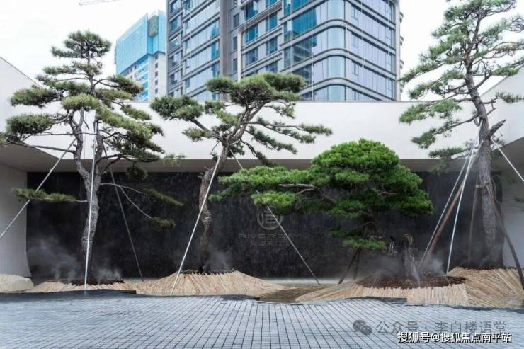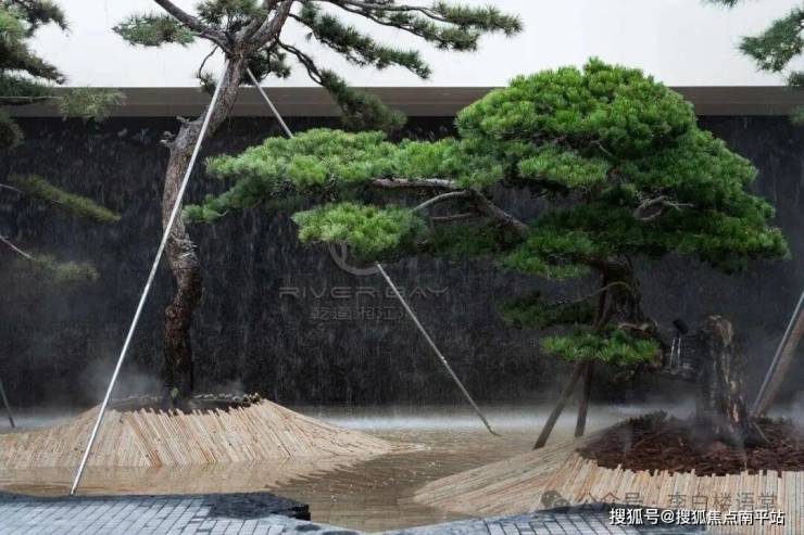 大门打造了150米超长门厅,4.5米高的奢石界面连体景墙,7米高大气门庭,无不凸显高端气质。卢浮宫同款土耳其进口大理石奢石景墙,在32株50万/株的古松下,显得硬朗又庄严;其中主门口的3株日本进口古松,每颗价格高达270万,搭配大门口的“水上升明月”艺术雕塑,高贵气质显露!