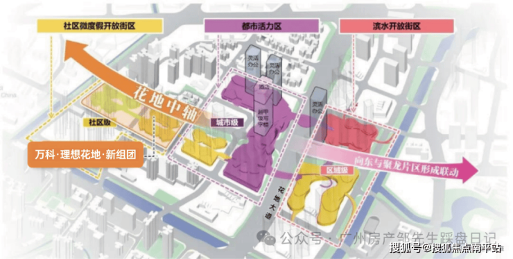 花地中轴,自西向东,串联起社区级微度假开放街区、城市级都市活力区、区域级滨水开放街区三大业态,重塑城市新格局。