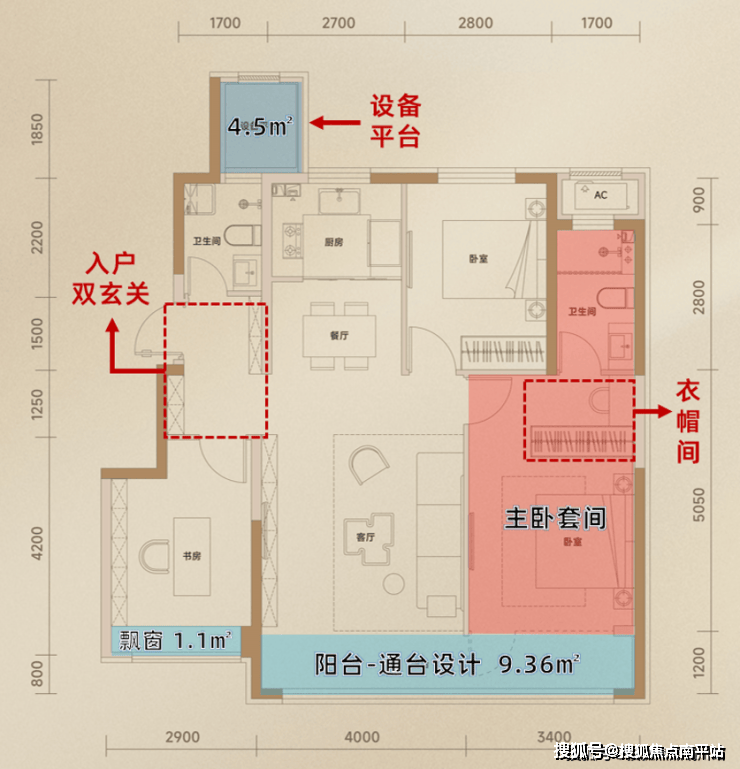 同样的,南向阳台赠送面积达到约9.36㎡,南向双飘窗约3.8㎡、设备平台约4.5㎡。