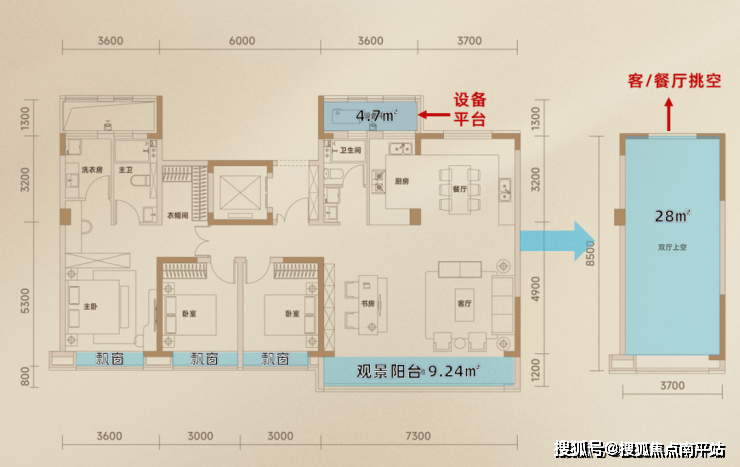面积赠送方面,除了9.24㎡的阳台、5.3㎡的南向飘窗、4.7㎡的设备平台这些常规部分,另一大“重头戏”便是在挑空上。