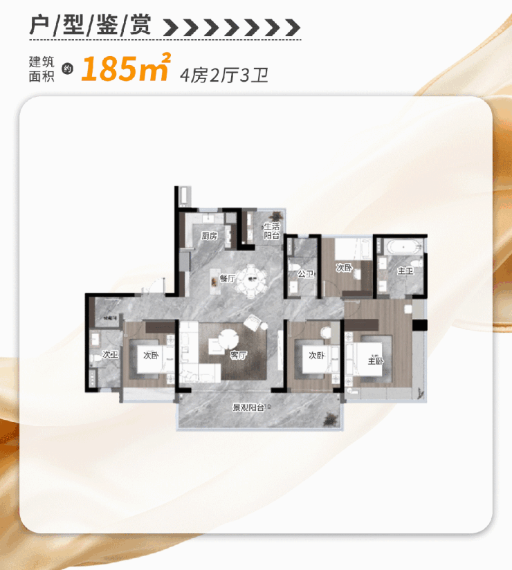 建面约185㎡大平层,是最受欢迎的明星户型。真正诠释了何为高阶人居范本,景观性、尊贵感以及尺度感上直接拉满。