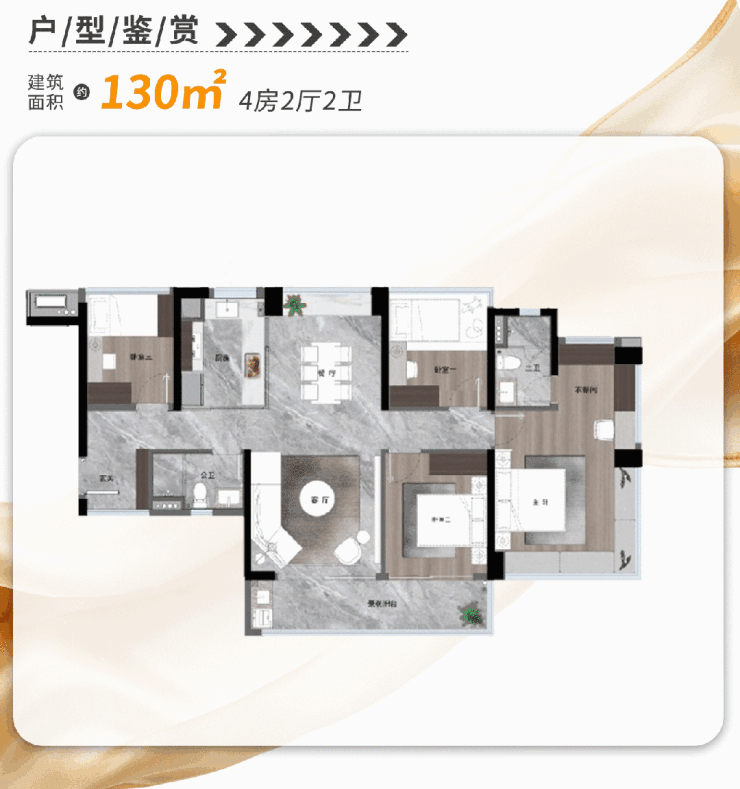 建面约130㎡四房,是项目首推户型中门槛相对较低的入门级产品,适合三代同堂家庭。