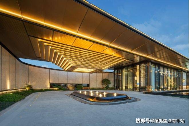 大门主入口引入“把酒店搬回家”的产品理念和“回家即度假”的生活理念,打造奢华酒店式归家大门。屋顶高约9.7米,整体挑檐向两侧延伸,长约49米,庑殿金顶的屋顶形态,以现代化的设计手法融入传统屋顶形式,结合鲁班锁倒影装置传达山水倒影的意境生活。来电咨询☎️☎️400-159-8559转接7777【☎营销部电话已认证】