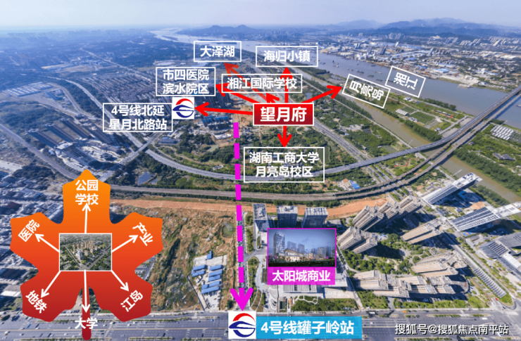 发现没,出了望月府家门,往四面八方延伸,600米内聚集了大量高能配套。根据几个箭头所示,特别像一片火红的“枫叶”。当下,岳麓山上的枫叶正燃烧,应景,用“枫叶”来阐述望月府的五维配套。其中江岛前文已述,其余的挑两个重点介绍!