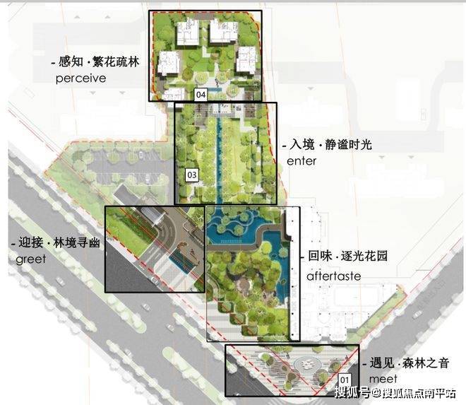 示范区根据行进路线,被划分为遇见「森林之音」、迎接「林境寻幽」、入境「静谧时光」、感知「繁花疏林」、回味「逐光花园」五大空间,在森与城的环拥之中,为锡东带来一次新的景观迭代。