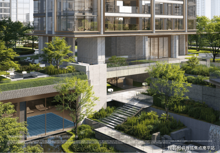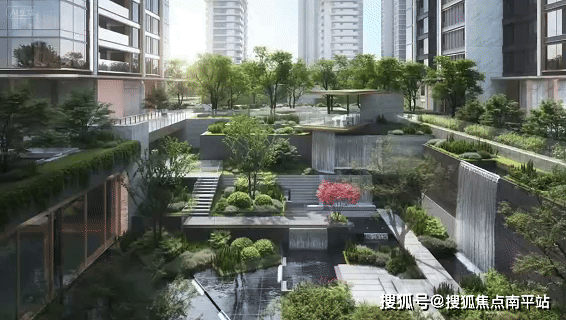 在过往长沙豪宅设计中,“下沉庭院”往往被简化为会所与园林“1+1”的组合:一个被水景、绿植包裹的盆地功能空间。而长沙瑞府四期,中心庭院不是简单的“社交功能+绿化点缀”的叠加,而是打造成 集归家动线、沉浸游园、观景平台、圈层社交、艺术赏趣于一体的“垂直生态生活体系”,让自然生机向上生长、向下渗透、向生活动线蔓延,串联进社区生活的每一次呼吸与驻足,形成一座“超复合式立体生命体”。