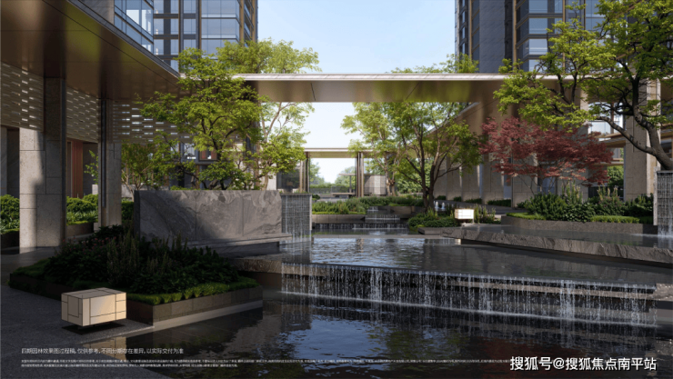 ③悬瀑游廊:打破传统下沉庭院“可远观,不可近玩”的距离感,通过台阶、汀步、廊桥、观景台,洄游穿插于悬瀑、绿岛之上,让景观极致渗透游园动线。水光树影,人行画中,在有限的山水尺度内赋予人无限的观感体验。