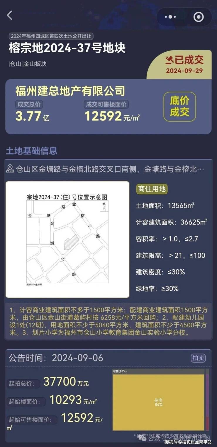 福州建总地产有限公司于2024年9月29日以底价3.77亿竞得榕宗地2024-37号地块,计容楼面价10293元/㎡,由于配建幼儿园和回购商业,可售楼面价约12592元/㎡,地块占地仅20.3亩,面积较小,计容约3.66万㎡;地块三面被产业园环绕,仅南侧的金档路为出行道路。