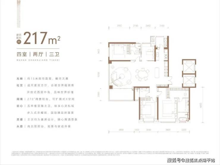 该户型南北通透,三开间朝南,客厅约6.6米的超大开间与“跑道式”阳台,南向约14米大面宽,武汉天地同款入户装甲门,室内空间感拉满;