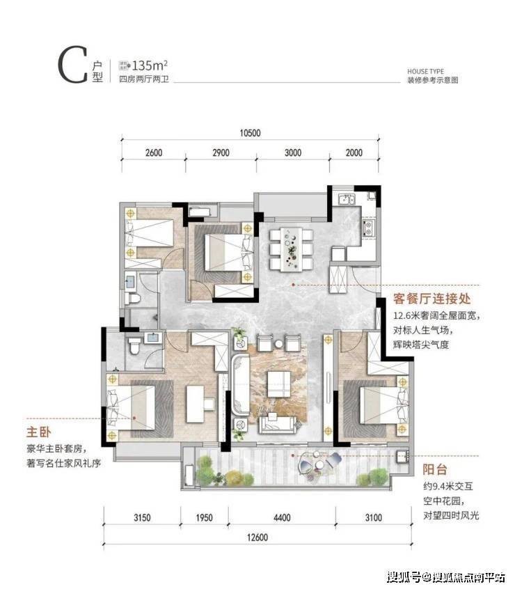 135㎡的四房两厅两卫,更大的主卧,星级的享受。该户型不仅有12.6米的奢阔全屋面宽,入户玄关、U型厨房、餐客厅一体设计、南北双阳台等身为一个优质户型的必要条件一个不少。户型亮点在于同时拥有约28㎡的星级总统套房式主卧与9.4米的超宽空中花园阳台,鱼与熊掌在此刻达到兼得。