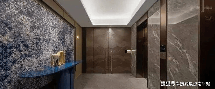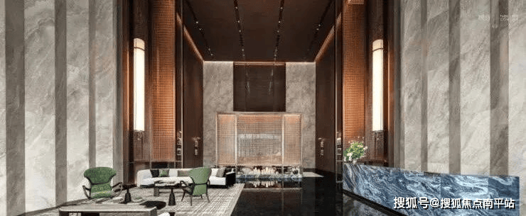 首层大堂约12米层高、约260㎡面积,水云灰石材墙面、太古黑金石材地面、紫山奢石接待前台,呈现出奢华酒店般的恢弘气度。