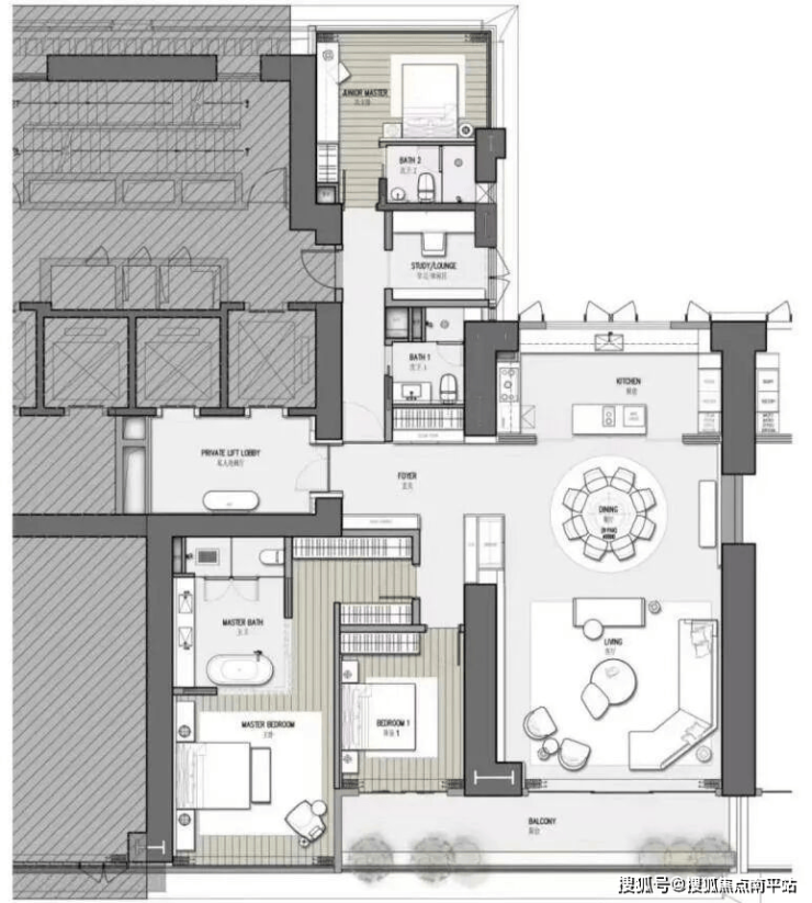 双入户动线、约3.5米层高、约90㎡的客餐厅搭配270°全景环幕落地窗,再加上约19米长的L型转角阳台,拥览CBD的万象繁华。