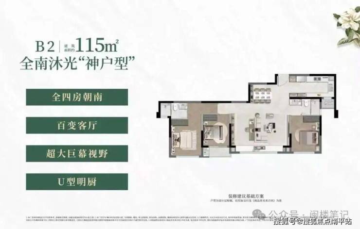 建面约 99㎡户型:“四叶草” 格局,全南向面宽约 12.2 米,配备 U 型明厨、独立生活阳台及储藏空间,为紧凑型三房两卫设计。
