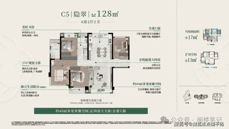 建面约 128㎡户型:边套设计,三面采光,南向面宽约 15 米,含 270° 观景主卧套房及全景 U 型明厨,部分户型配备独立玄关与约 40㎡客餐厅。